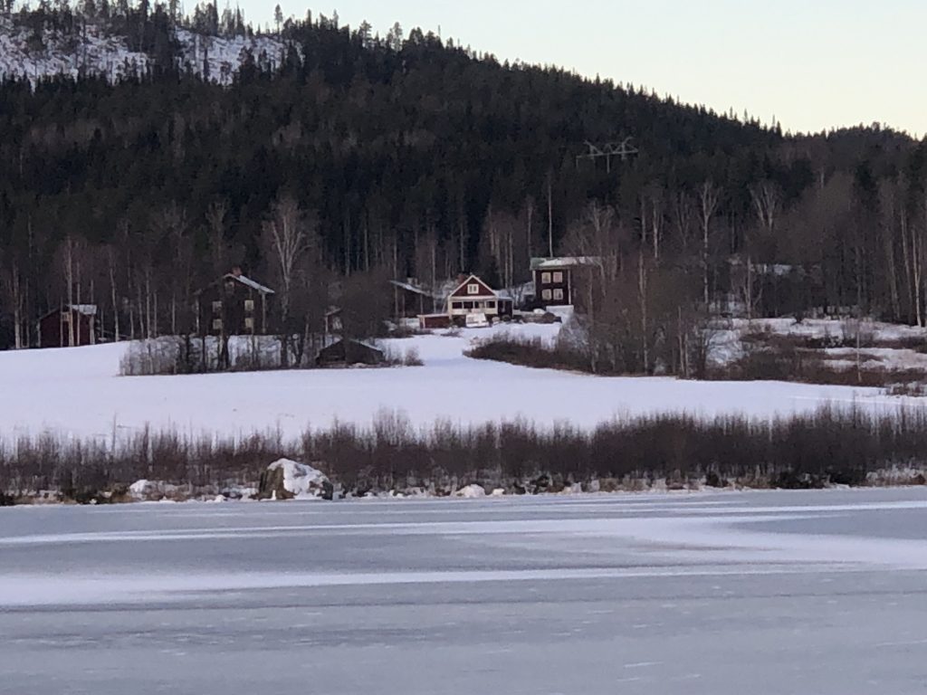 För 3 dagar sedan tisdag 10 december kunde jag inte hålla mej längre. Jag måste ner och kolla isen! Hunden och gubben följde glatt med. Vi hade ingen isborr, men genom den klara isen kunde man se där sprickorna gick att den var uppskattningsvis kanske var ca 10 cm tjock. Man borde kanske ha borrat, men… Vi gick ända ut dit det frös sist och tjock svartis är vackert! Utsikten över byn från sjön är också vacker!