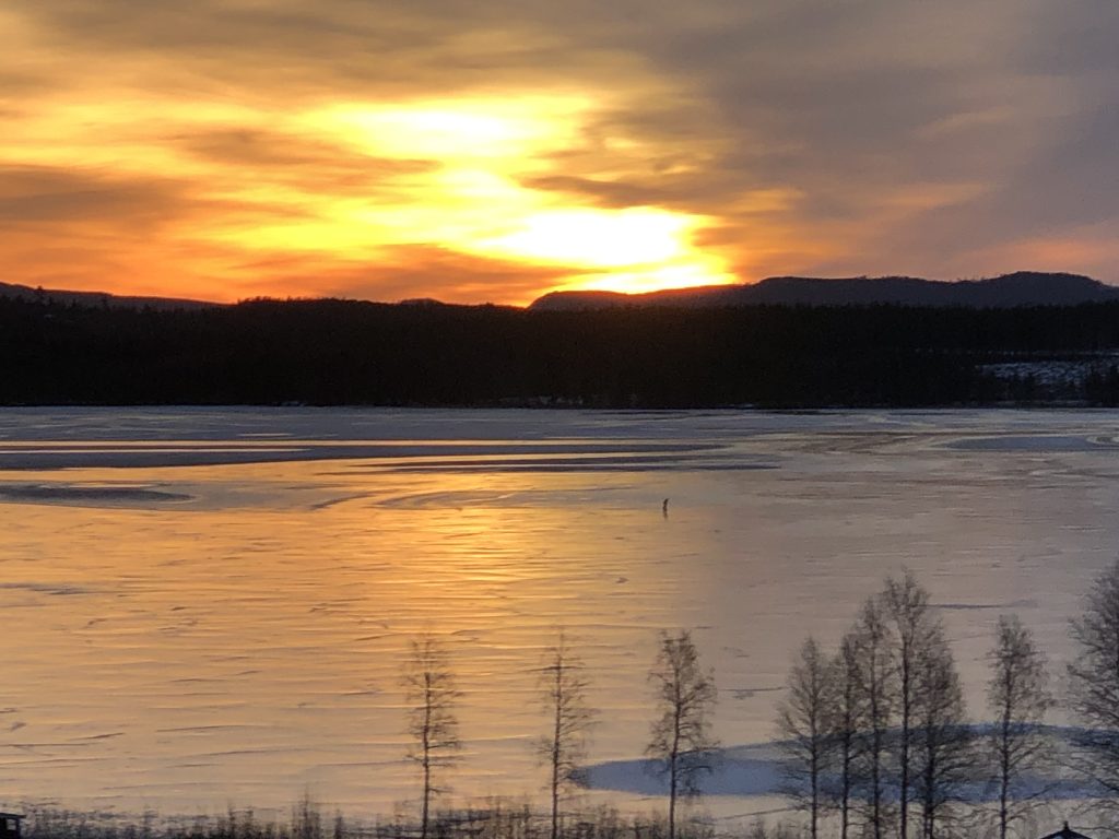 I den gyllene soluppgången är skridskoåkaren ute på sjön igen. Säkert en härlig tur! Det är mycket sällsynt med en sådan fantastisk skridskois på sjön som just nu. Det är många år sedan senast det hände. 0ftast kommer det snö som lägger sig på isen och sedan tränger det många gånger dessutom upp vatten under snön. Nu är det perfekt is över hela sjön med bara enstaka snöfläckar. Naturligtvis måste man var försiktig för det kanske kan finnas vakar, men är det blankis utan snö kan man ju se riskabla områden bättre.
